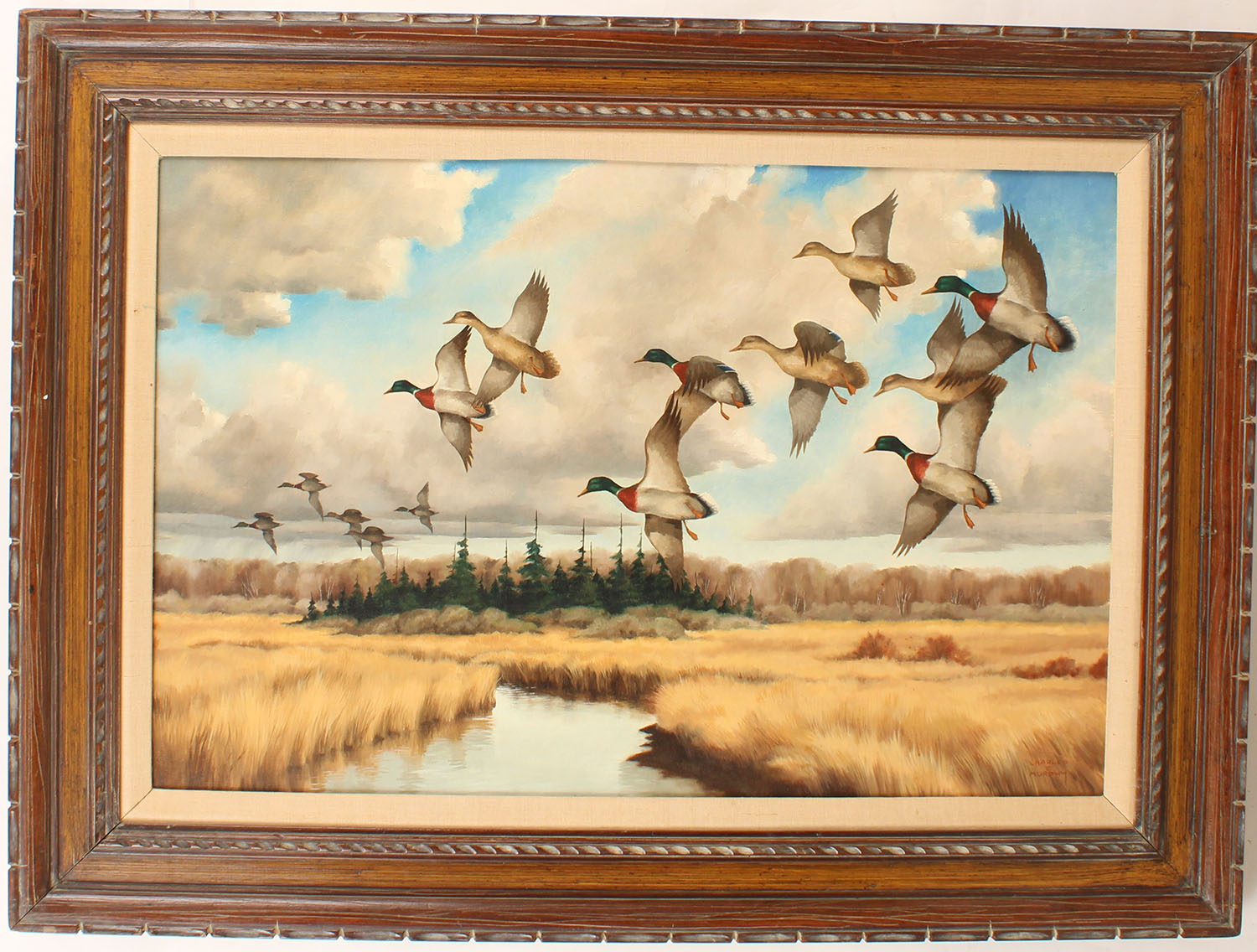 Print on canvas pictures mallards in flight over creek & marsh grass, 29 1/2'' x 19 1/2'' image size, framed & matted. Grade: Excellent ++ - Value: 30 to 200