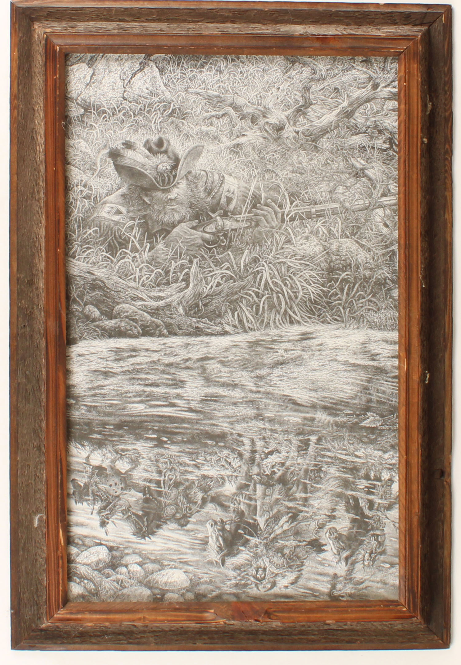 Interesting print of a pencil drawing, one end pictures native americans riding horse back looking for something & then when you flip it over you see a frontiersman hiding in the tall grass with a gun, 12 1/2'' x 20 1/2'' image size, framed. Grade: Excellent - Value: 20 to 200