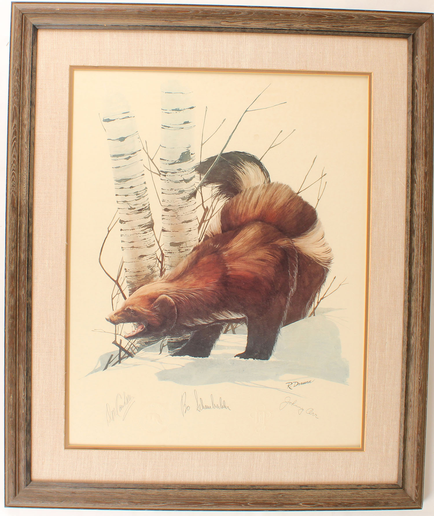 University of Michigan Athletic Dept. Print signed by The football coach BO SCHEMBECHLER, The AD Don Canham and the Basketball Coach Johnny Orr, pictures a full color Wolverine in a snow scene, artis R. Dorman, has impressed seal of the Athletic dept, 22'' x 28'' image size, framed & matted. Grade: Excellent ++ - Value: 50 to 500
