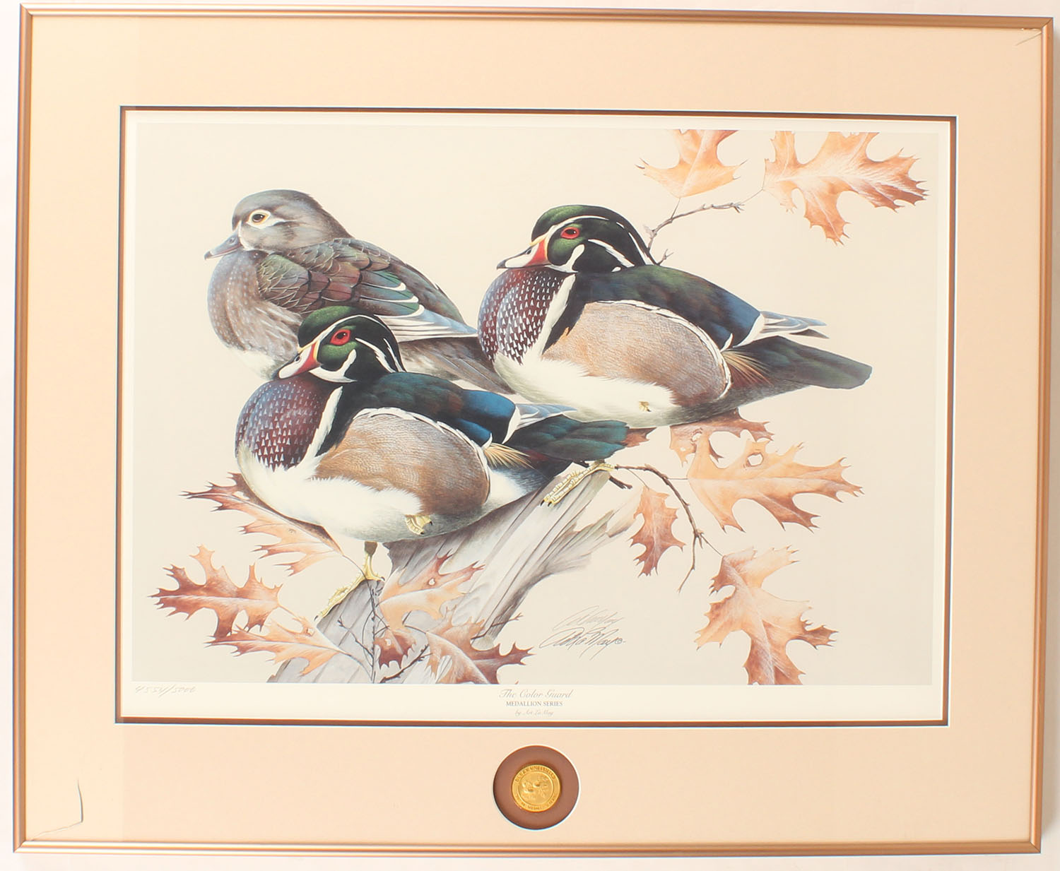 The Color Guard Medallion Series by Art LaMay, pictures woodducks sting on log, absolutely beautiful colors, 23'' x 16'' image size, framed & matted, glass has a small crack lower left, 4554/5000. Grade: Excellent ++ - Value: 20 to 200