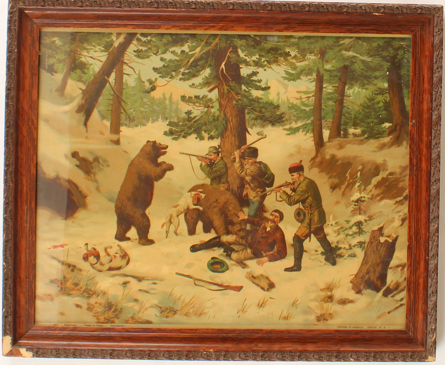 German Print pictures three hunters in snow scene fighting off two grizzly bears, very dramatic scene, 20'' x 15 1/2'' image size, framed. Grade: Excellent - Value: 20 to 200