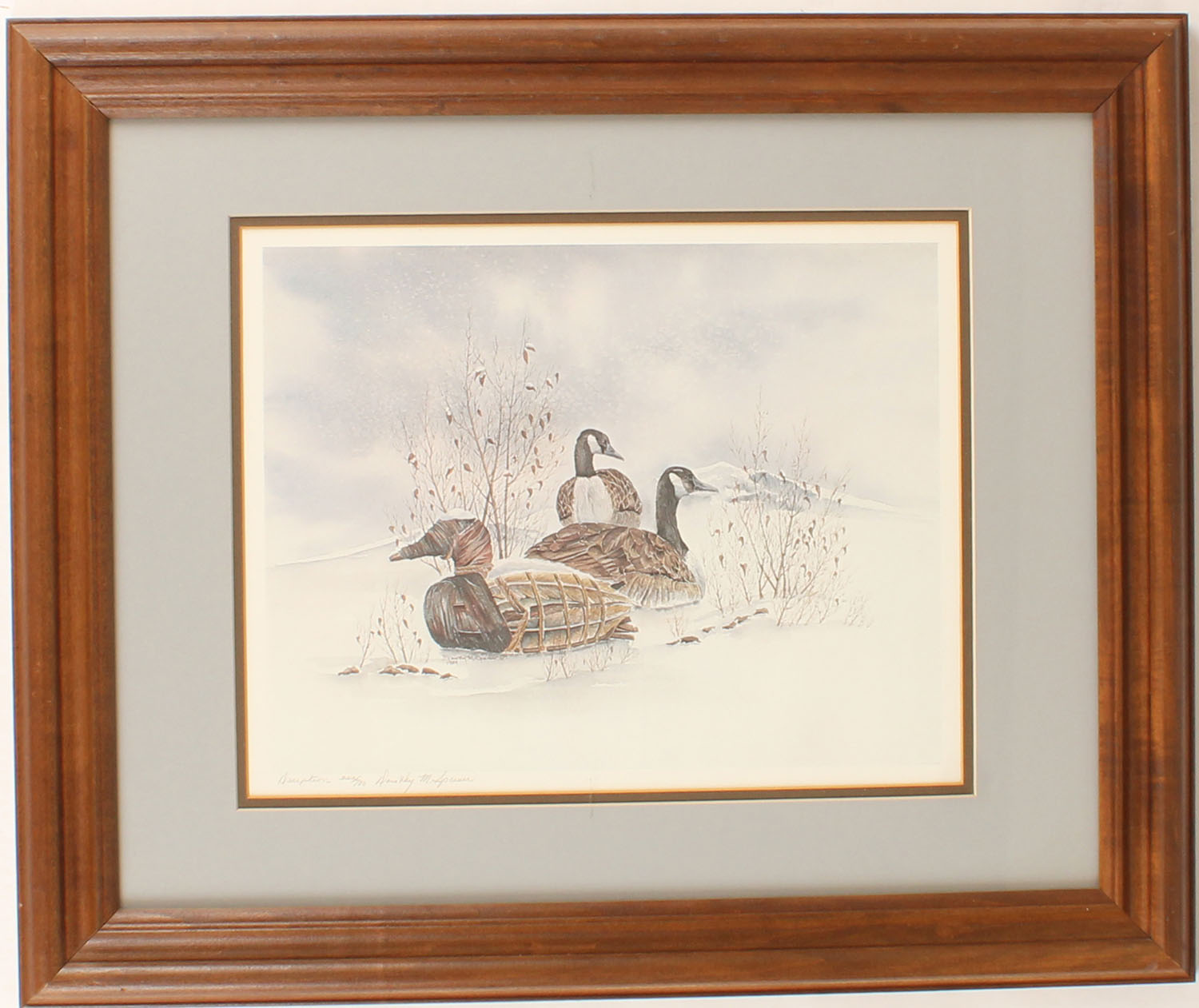 Deception print by Dorthy M Spencer, pictures an old native american canvasback decoy in the snow that lured in tow canada geese, 13 1/2'' x 10 1/2'' image size, framed & matted, 322/700. Grade: Excellent ++ - Value: 10 to 100
