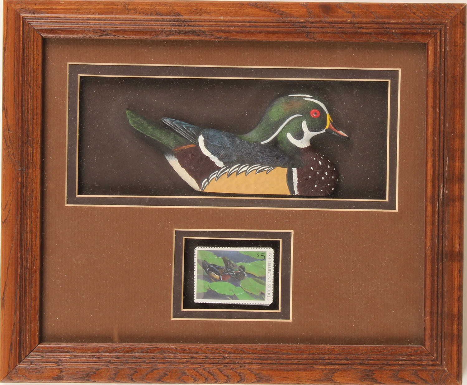 Ducks Unlimited stamp with Woodduck Drake wood carved in picture frame, 11 1/2'' x 9 1/2''. Grade: MINT - Value: 10 to 50