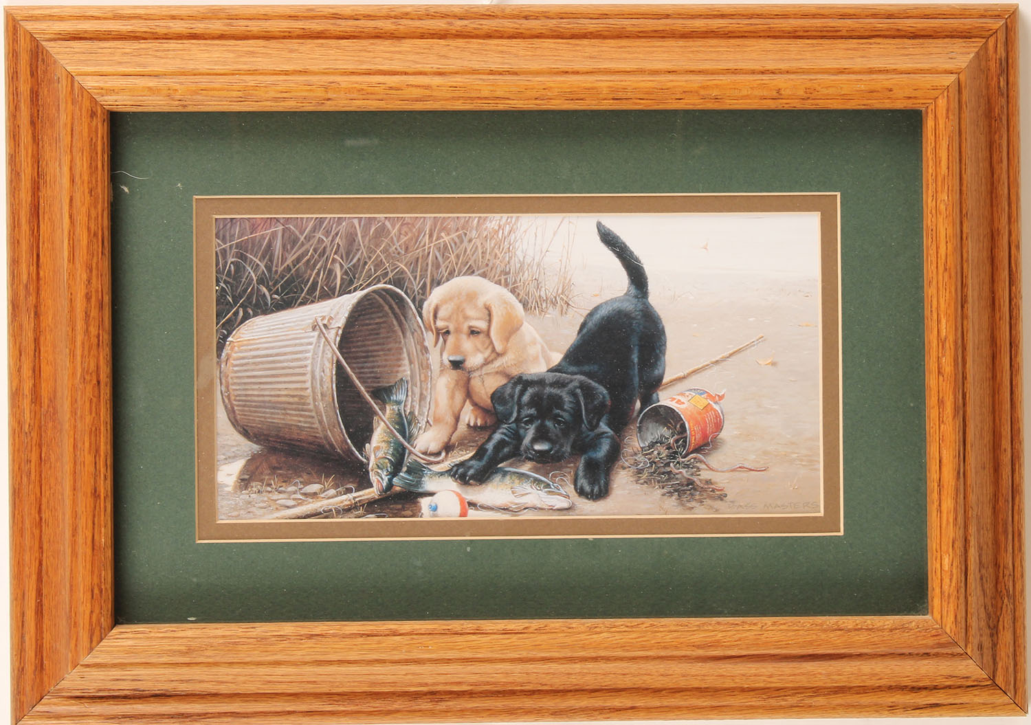 Puppies playing with fish in a bucket, 15'' x 11'', framed & matted. Grade: Excellent - Value: 2 to 20