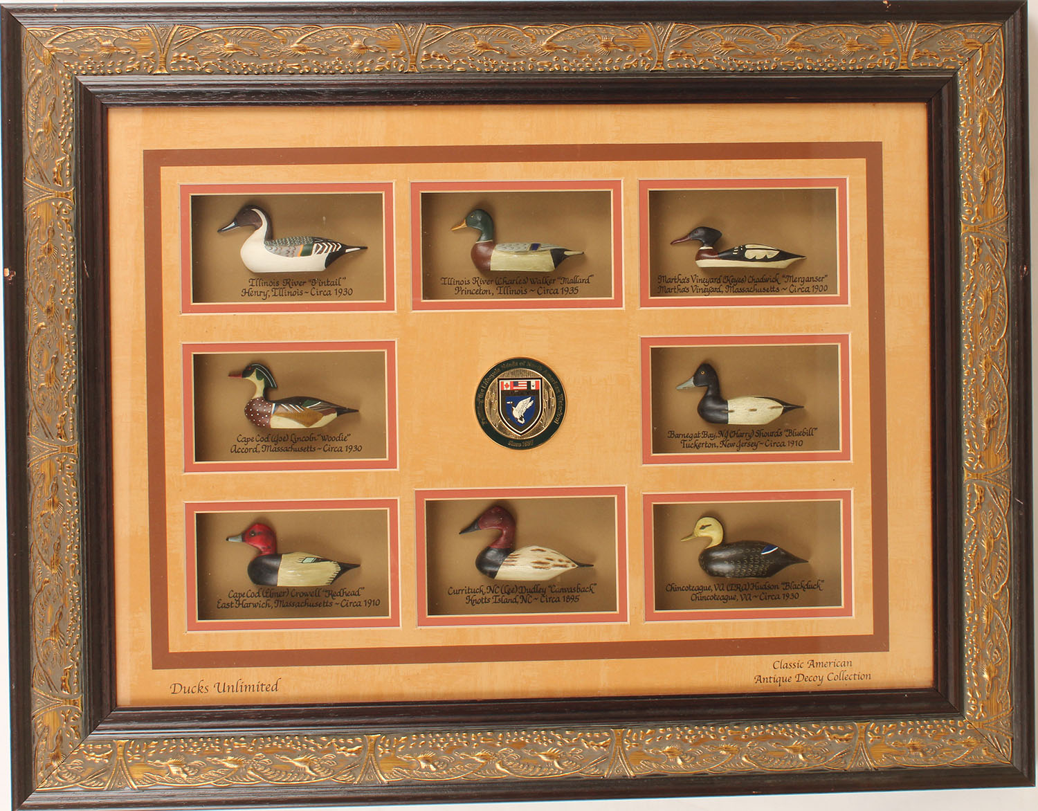 DU Hand Carved decoys, Classic American Antique Decoy Collection'', each decoy is hand carved & pained, each on is labeled in a shadow box, framed, 31'' x 24''. Grade: MINT - Value: 1000 to 1200