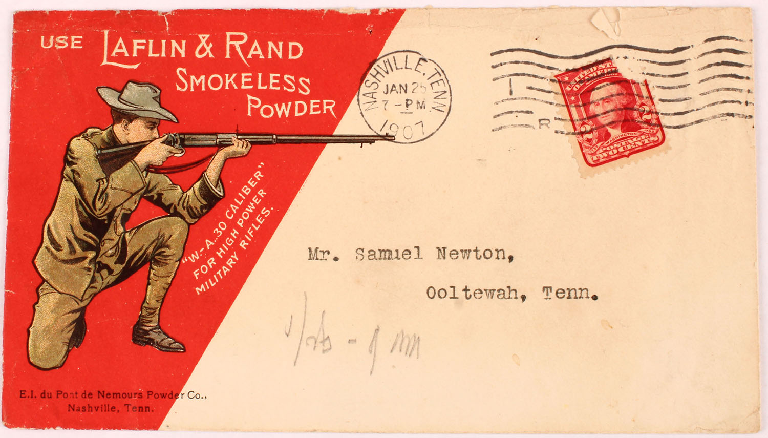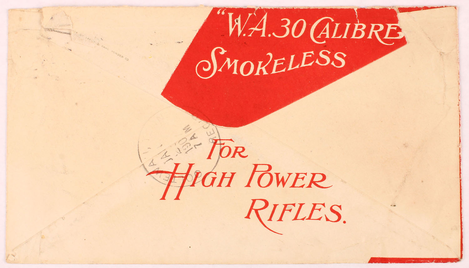 RARE Laflin & Rand Smokeless Powder Co. Envelope, dated 1907, full color image of hunter shooting from the prone position with red background. Grade: Very Good ++ - Value: 100 to 500