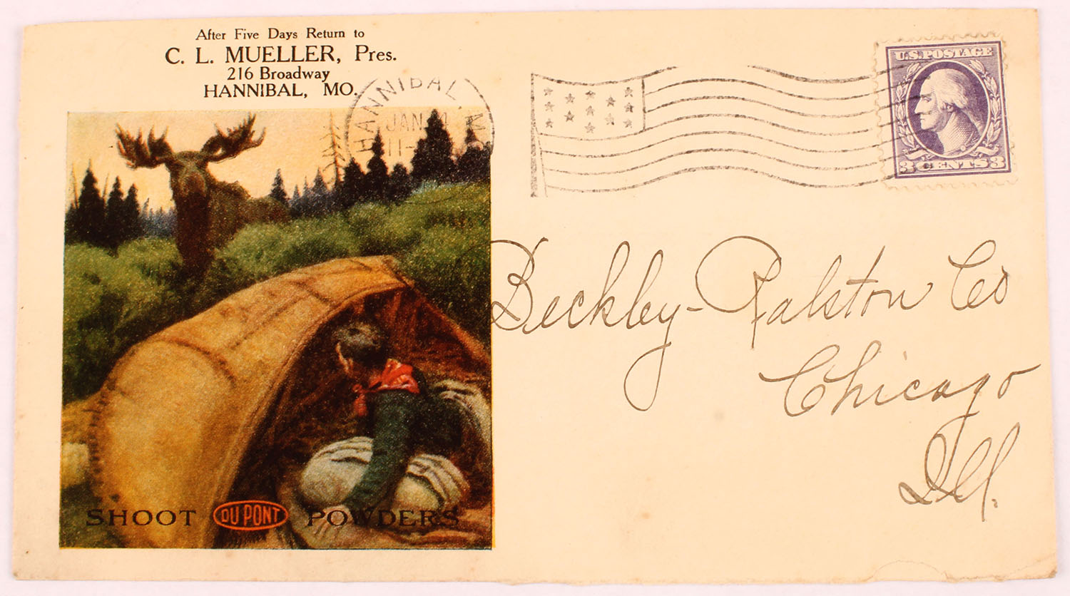 Shoot Dupont Powders Envelope, used, full color image of hunter hidden under a birch canoe reaching for his rifle as a bull moose is approaching. Grade: Excellent - Value: 100 to 300