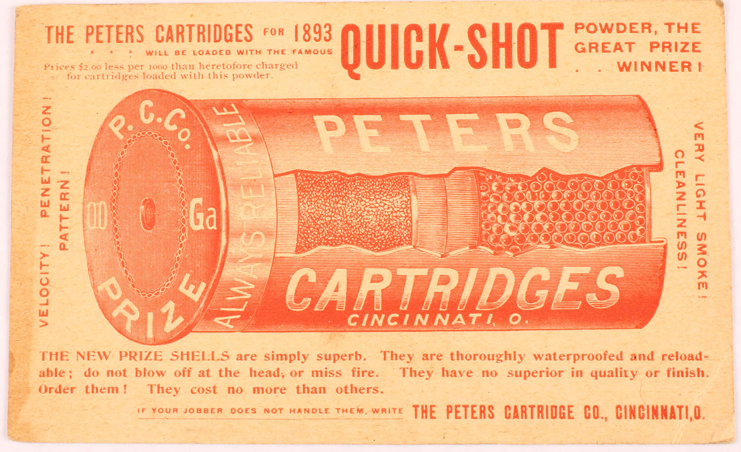 RARE Advertising card for Peters PRIZE & QUICK SHOT, has large red Cut-A-Way shot shell, VERY RARE & HARD TO FIND! Grade: Excellent - Value: 50 to 500