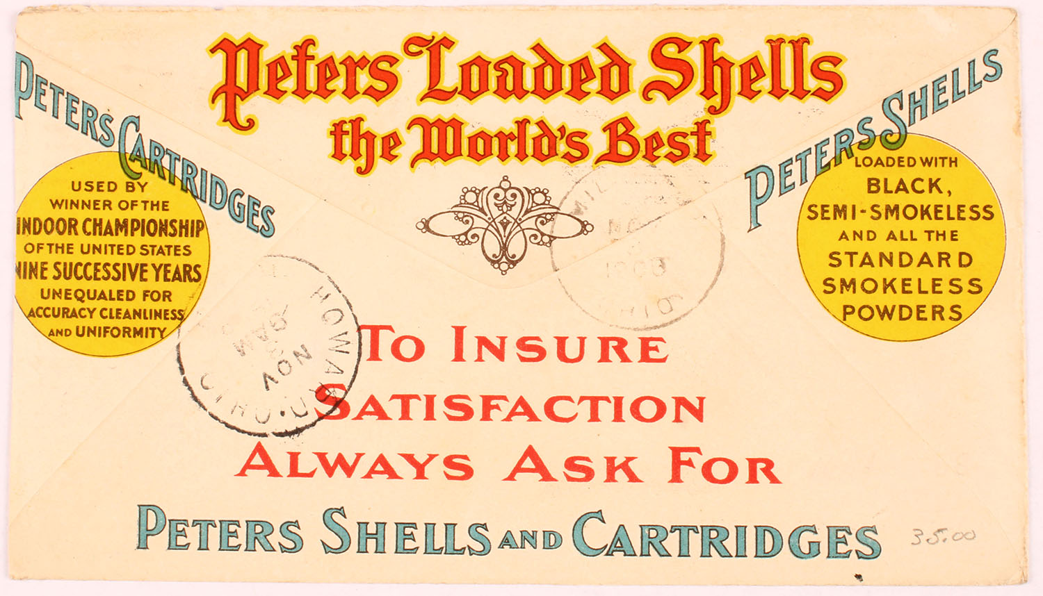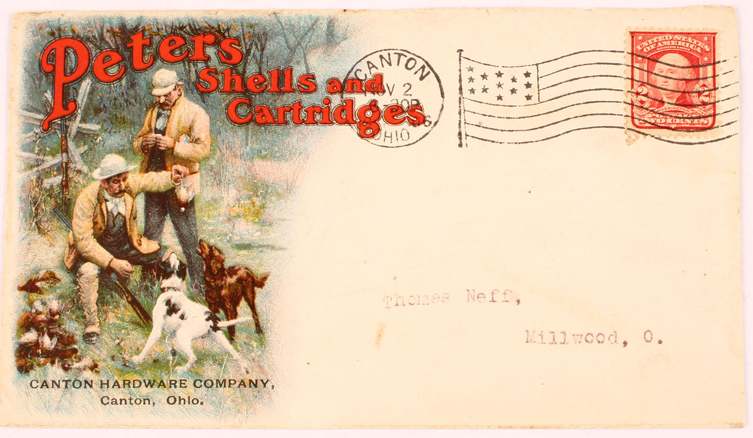 RARE Peters Cart. Co. Envelope, dated 1919, pictures full color image of hunters with upland dogs, very colorful front & back. Grade: Excellent - Value: 100 to 500