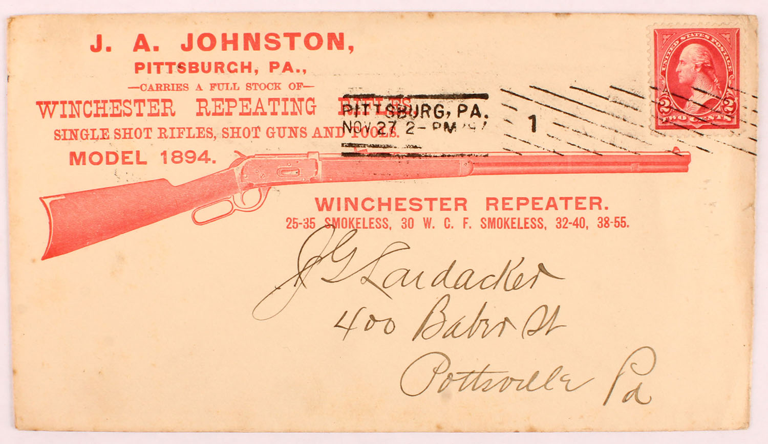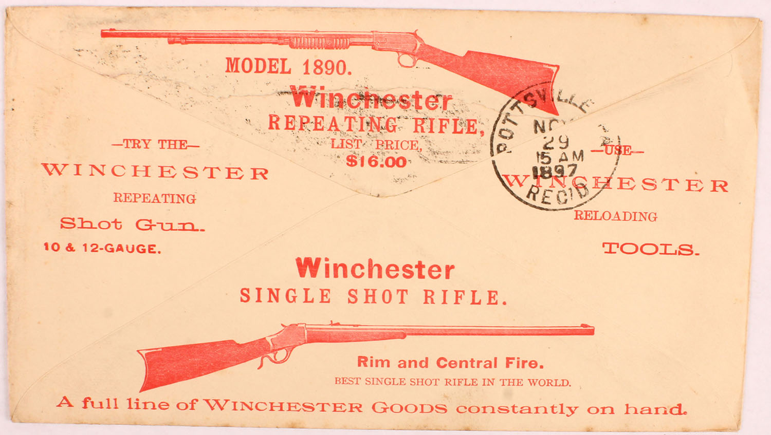 Winchester Repeating Rifles, Single Shot Rifles, Shot guns and Tools Envelope, dated 1897, pictures 1894 rifle on front & more rifles on back, torn on right side. Grade: Excellent - Value: 20 to 80
