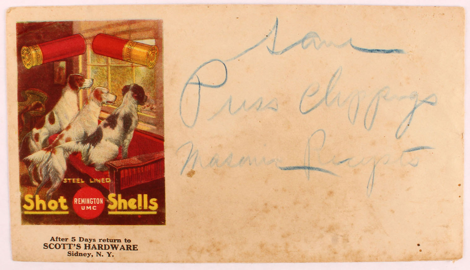 RARE Remington UMC Shot Shells Envelope, pictures three hunting dogs looking out a window with shot shells above, never mailed but has hand writing on front, nice colors. Grade: Very Good ++ - Value: 50 to 250