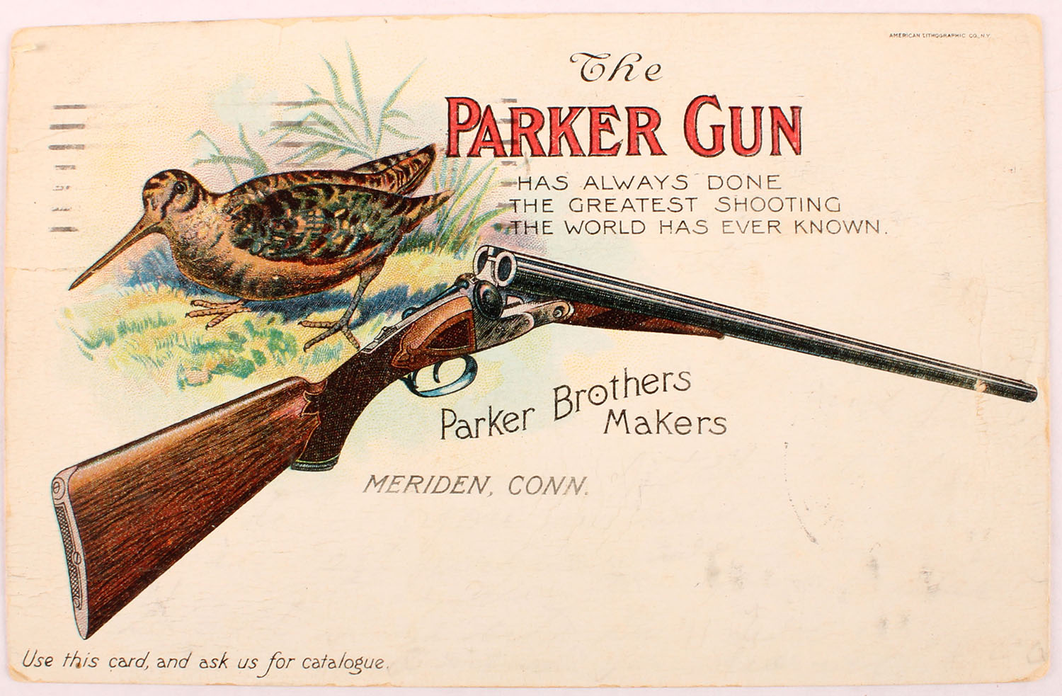 Parker Gun post card, dated 1905, great full color image of woodcock & double shotgun. Grade: Excellent - Value: 50 to 300