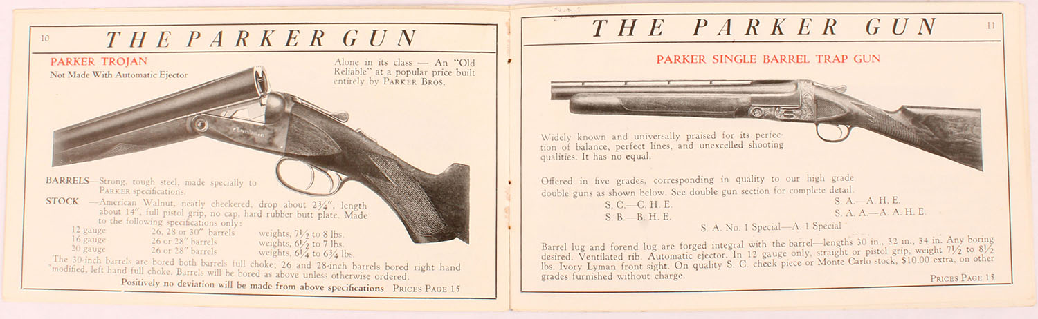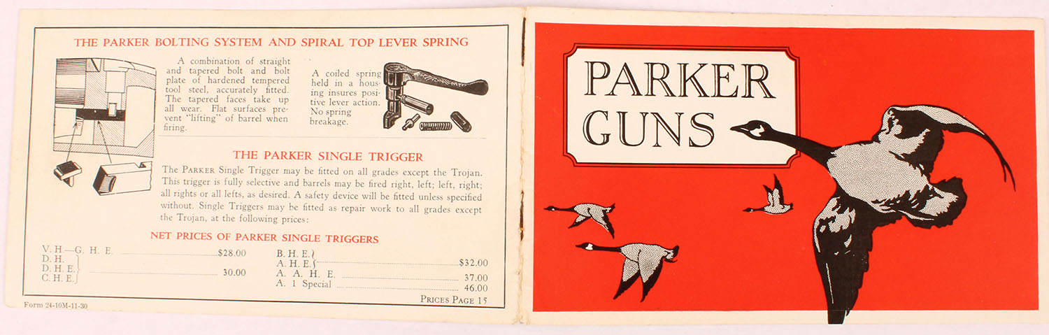 Parker Guns Booklet, has geese flying on cover with red background, 6 1/4'' x 3 1/2'', 15 pages, Form 24-10M-11-30. Grade: MINT - Value: 20 to 150