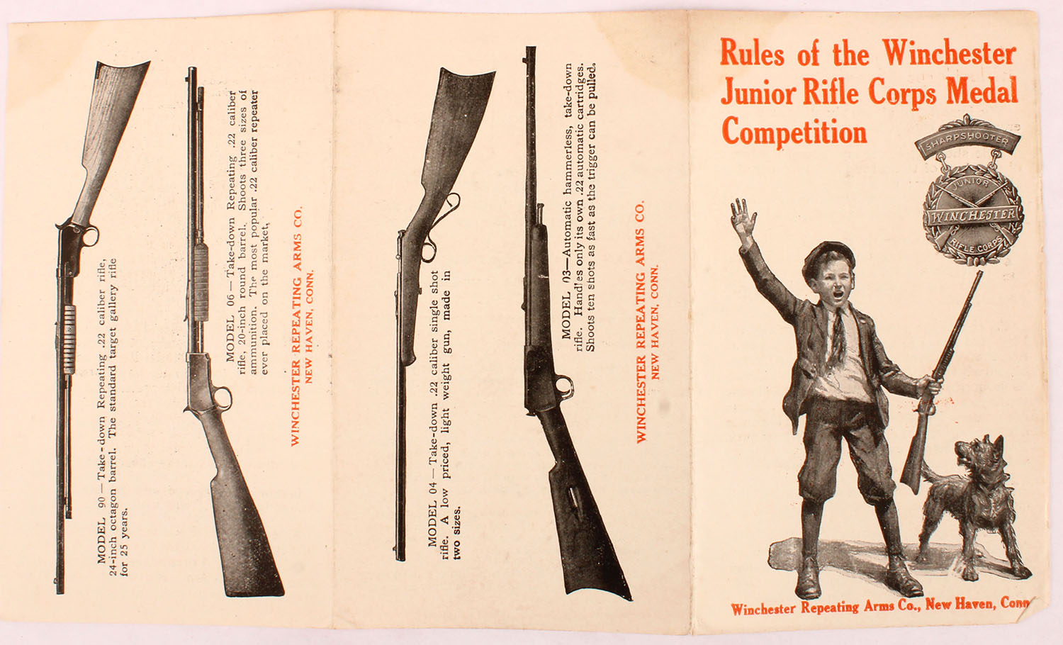 Winchester Junior Rifle Crop tri-fold brochure, ''Rules of the Winchester Junior Rifle Corps Medal Competition'', 3 1/2'' x 6 1/4'', many .22 rifles are pictured. Grade: Excellent - Value: 10 to 100