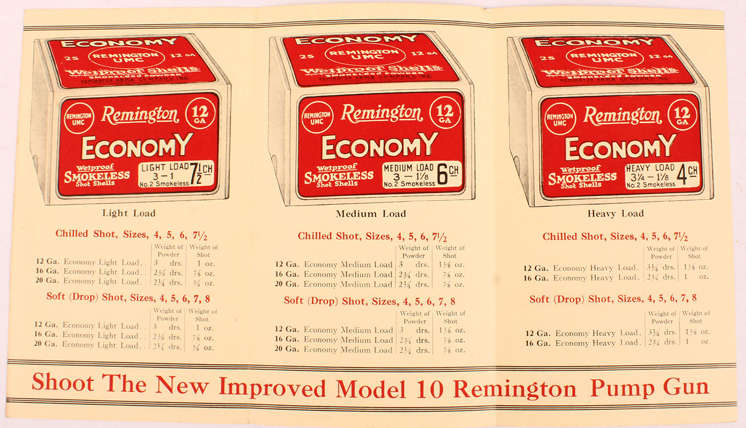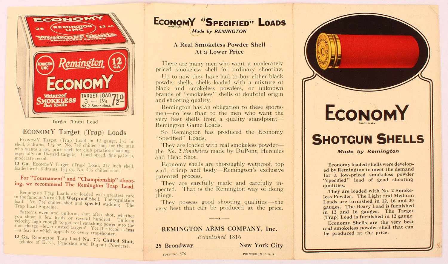 Remington ECONOMY tri-fold brochure, ''Economy Shotgun Shells'', 3 1/2'' x 6 1/4'', four full color 2pc boxes are pictured. Grade: Excellent ++ - Value: 10 to 100