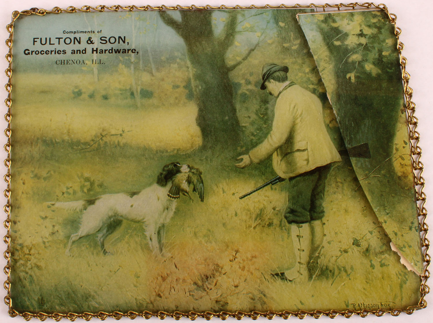 Fulton & Son Groceries & Hardware Chain Art, pictures settler retrieving a bird to the hunter, 8 1/4'' x 6'', has a crack to glass on right side. Grade: Very Good - Value: 2 to 30