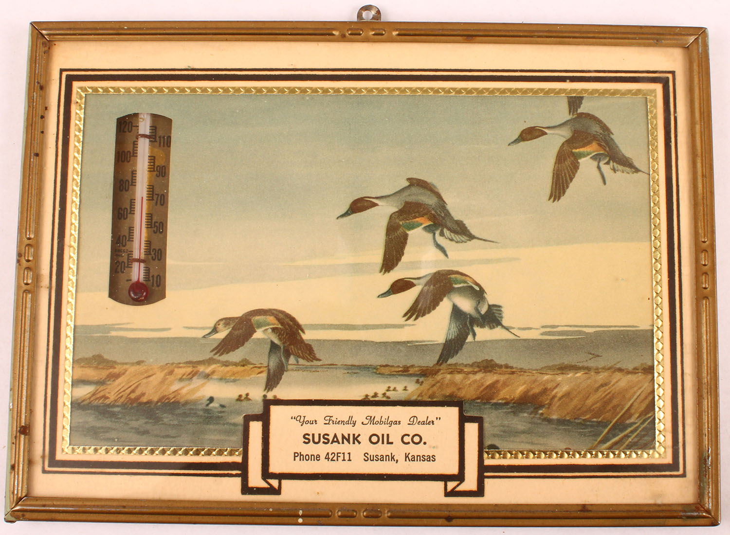Pintails landing advertising thermometer for Susank Oil Co., 7'' x 5''. Grade: Excellent - Value: 10 to 50