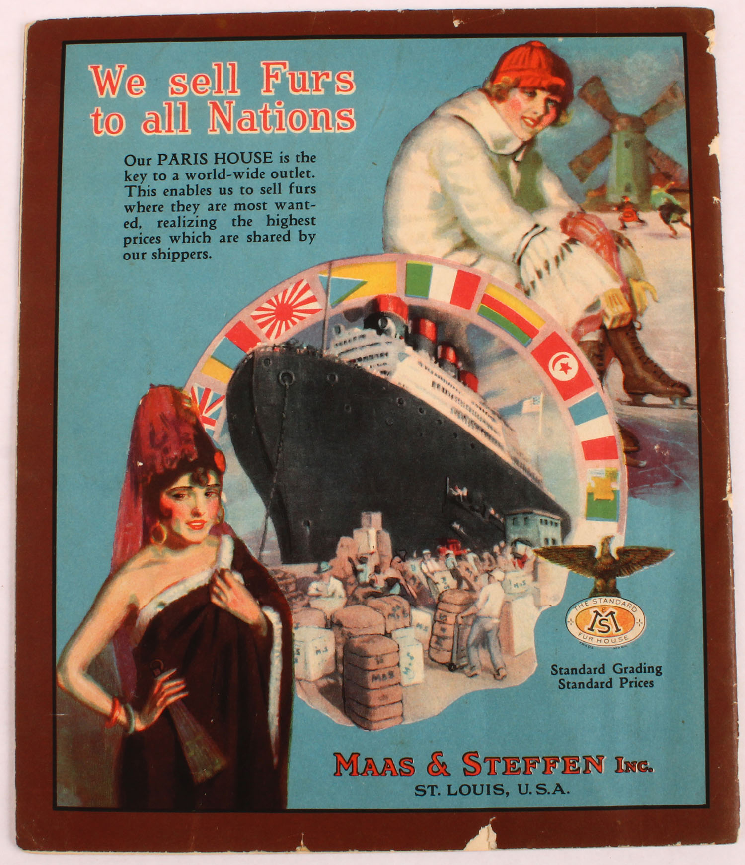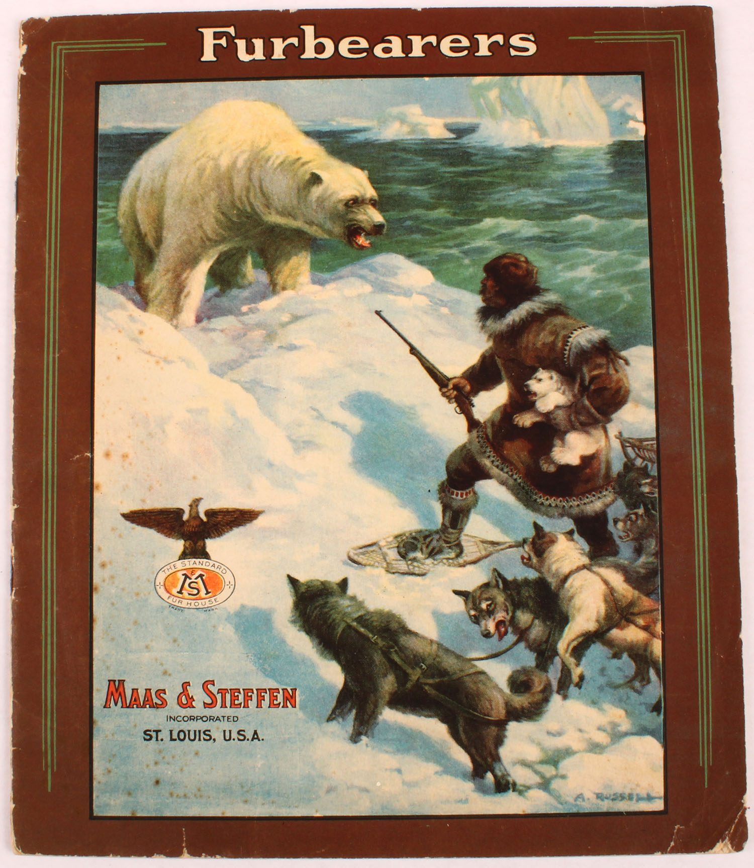 1927 Maas & Steffen full line catalog, Cover pictures the rare image of trapper on ice with polar bear on the attack, ''Furbearers'', 26 pages, 7 1/4'' x 9'', every page has a wonderful full color image of animals. Grade: Excellent - Value: 20 to 100