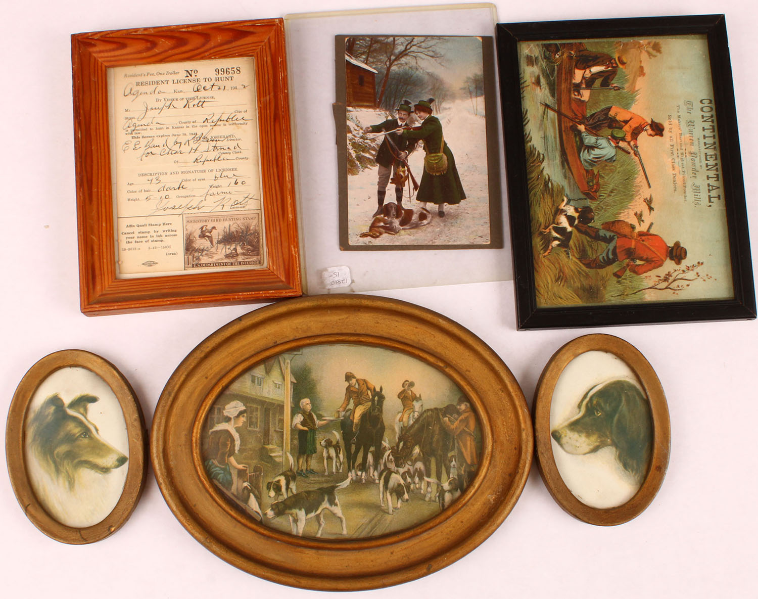 Lot of framed images & hunting lic. Grade: Excellent - Value: 2 to 50