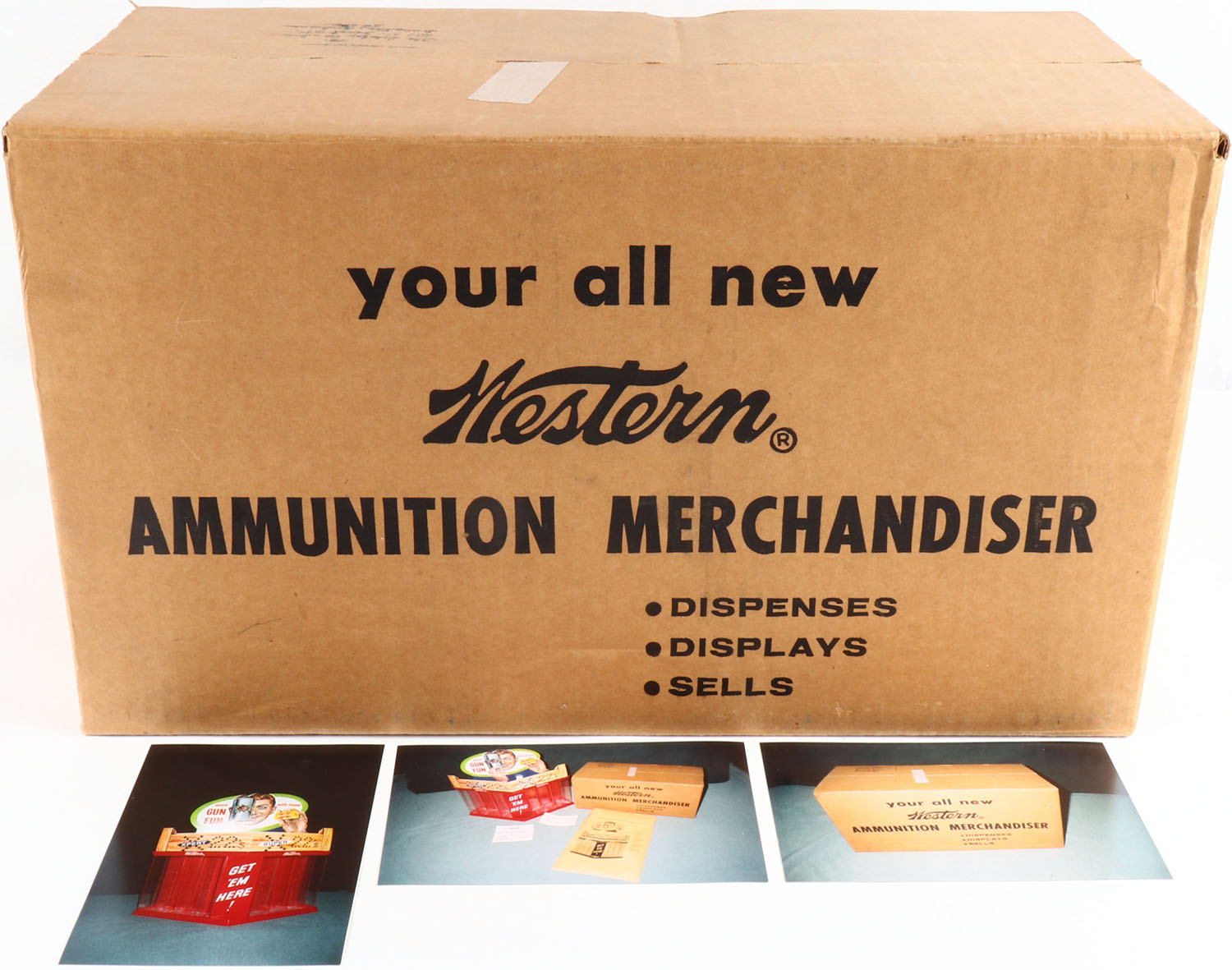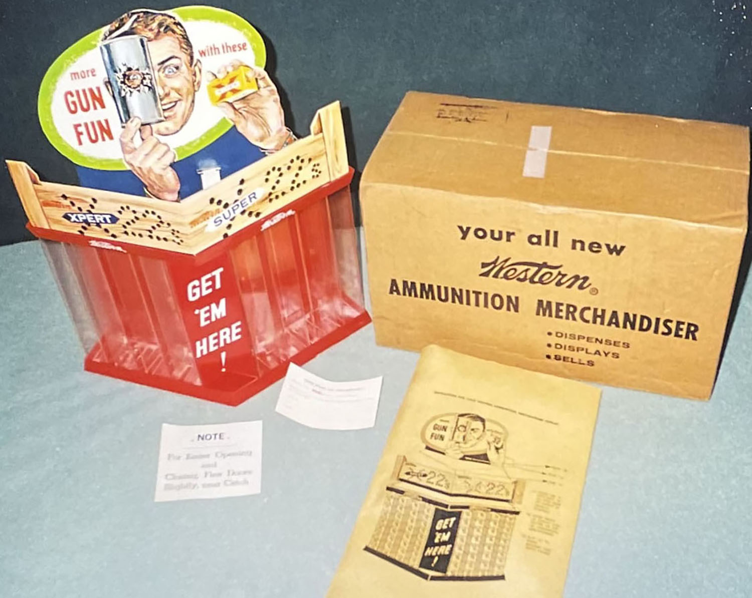 RARE Western SUPER-X & XPERT .22 3D display, SEALED IN ORGINAL BOX WITH MINT DIECUT ON TOP, the photos are used from an other box that we opened, ''GET 'EM HERE!'', two sided display holds many .22's for your collection, the diecut on top pictures a man holding a tin can with a large hole in it plus a .22 box, Grade: MINT - Value: 1000 to 2000