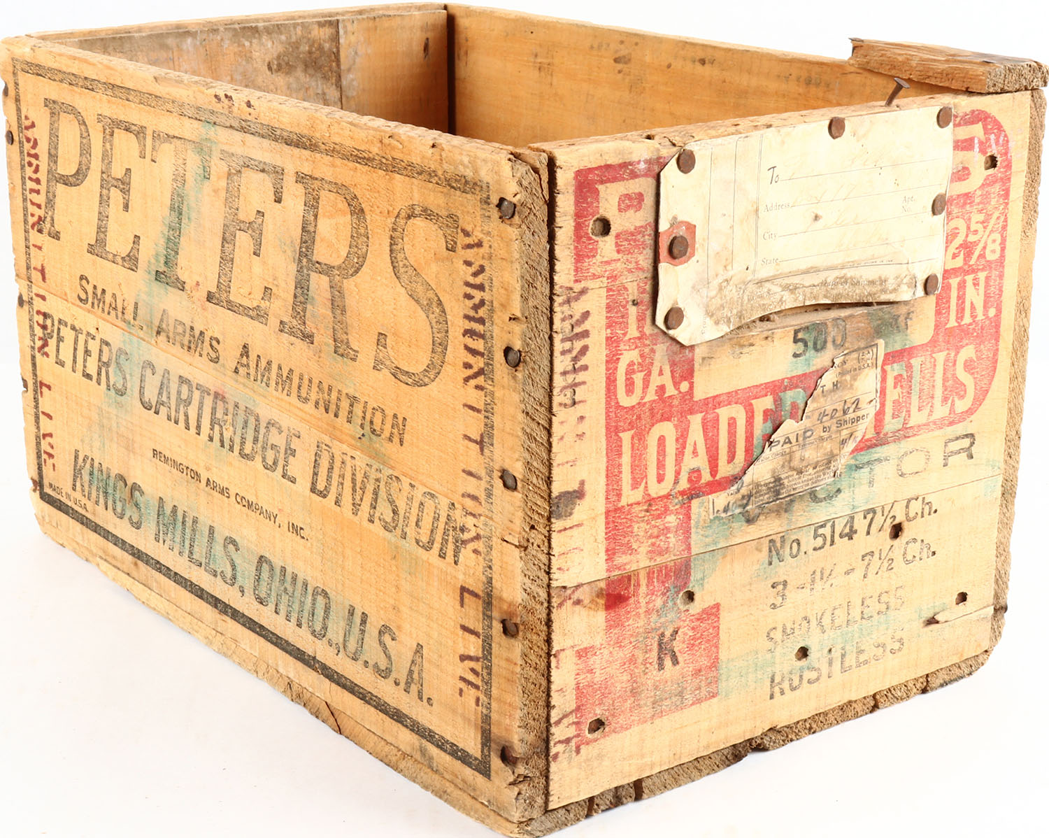 Peters Victor wood shipping crate, 12 ga., No. 514 7 1/2 ch., nail construction, red & black is faded. Grade: Excellent - Value: 10 to 100