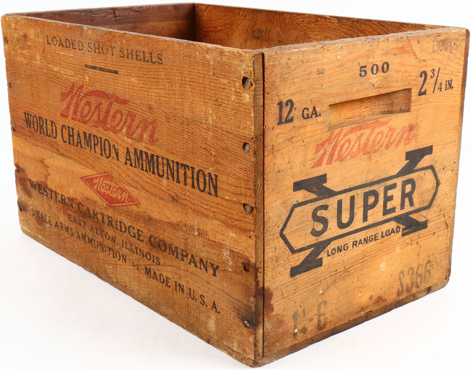 Western Super-X, 12 Ga., nail construction wood shipping crate, black & red print is solid, has age soiling, overall very solid. Grade: Excellent - Value: 10 to 40