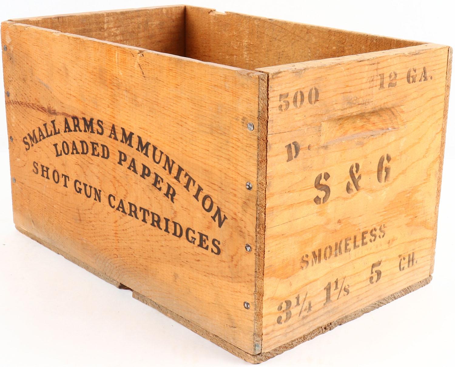 Small Ammo Loaded Paper shotshells wood shipping crate, 12 ga., nail construction black print is solid, crate has age soiling. Grade: Very Good + - Value: 6 to 50