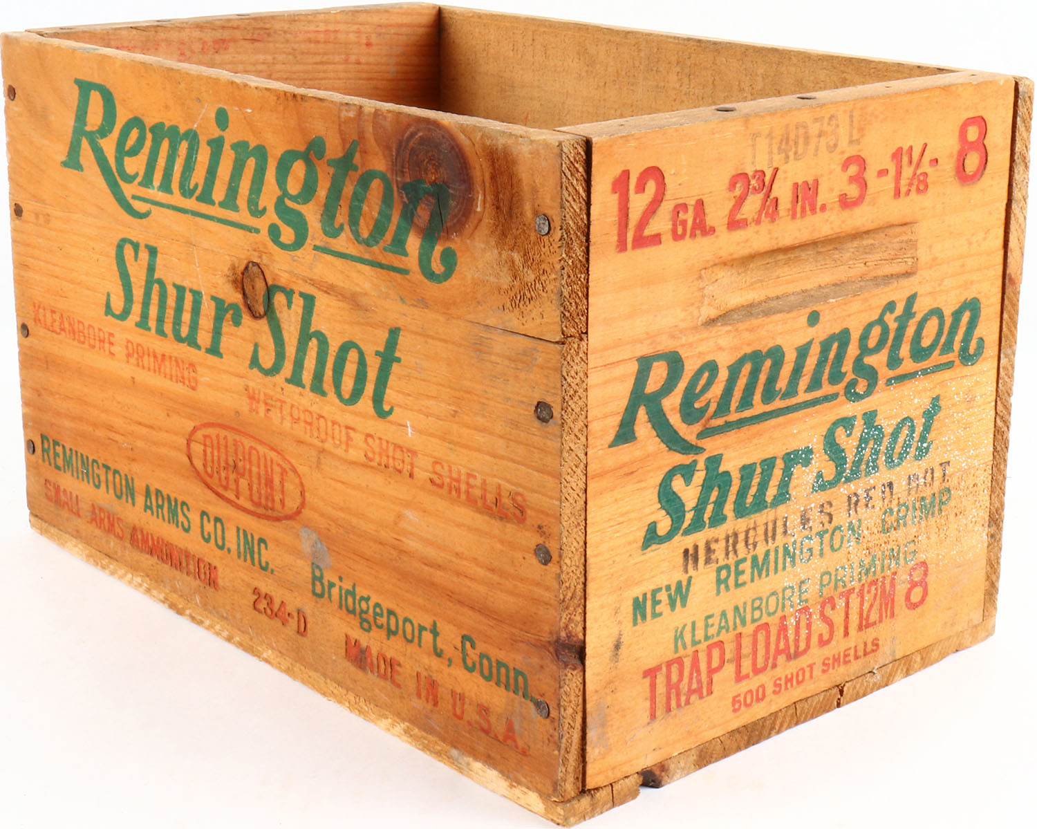 Remington Shur Shot, 12 Ga., 8 shot, nail construction, red, & green print is bright and clean and crate is solid. Grade: Excellent - Value: 10 to 50