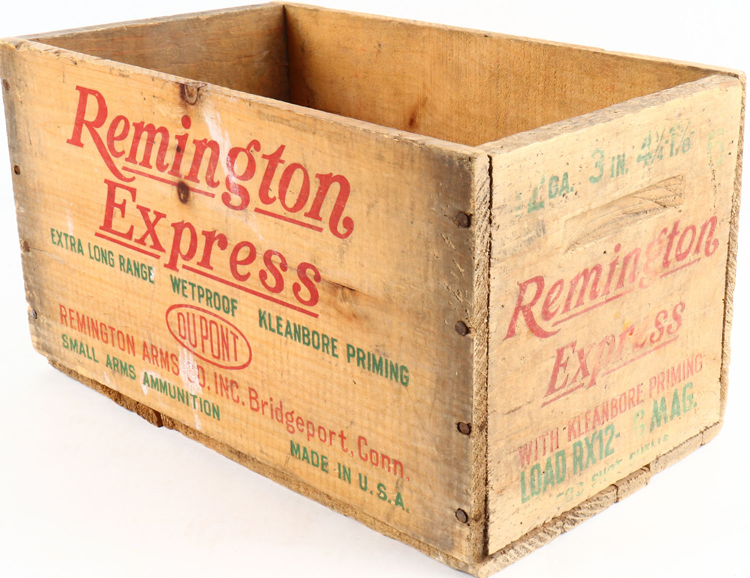 Remington Express, 12 Ga., 6 shot MAG, nail construction, red, & green print have some fading and has cracked on the bottom. Grade: Very Good - Value: 6 to 40