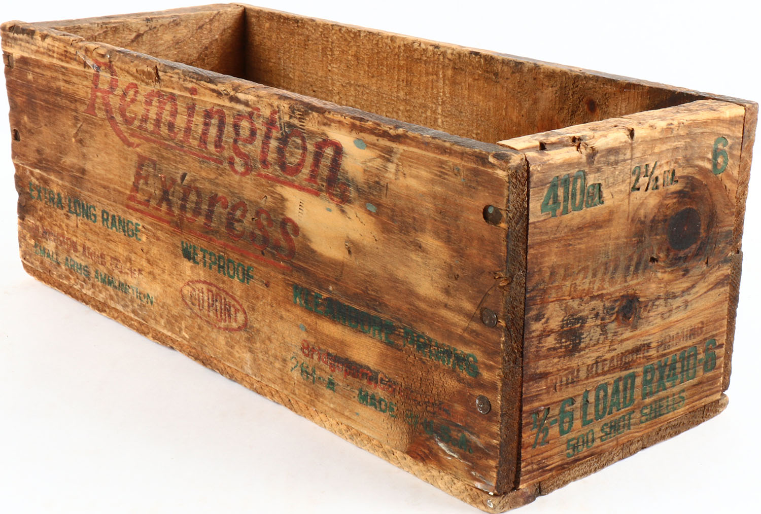 Remington Nitro Express, 410 Ga., nail construction, red, & green print is faded and crate has age soiling. Grade: Very Good - Value: 10 to 40