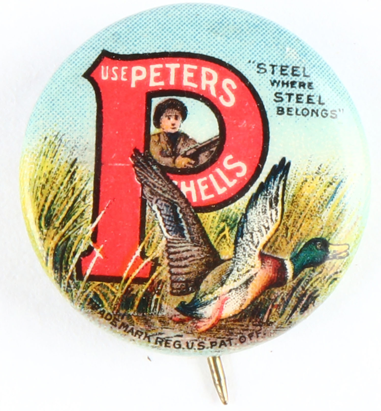 Peters Pinback, pictures a man duck hunting inside a large red P & mallard duck, 7/8'', Bastain Bros paperback, pin is solid & paperback shows minor age soiling . Grade: Excellent - Value: 16 to 60