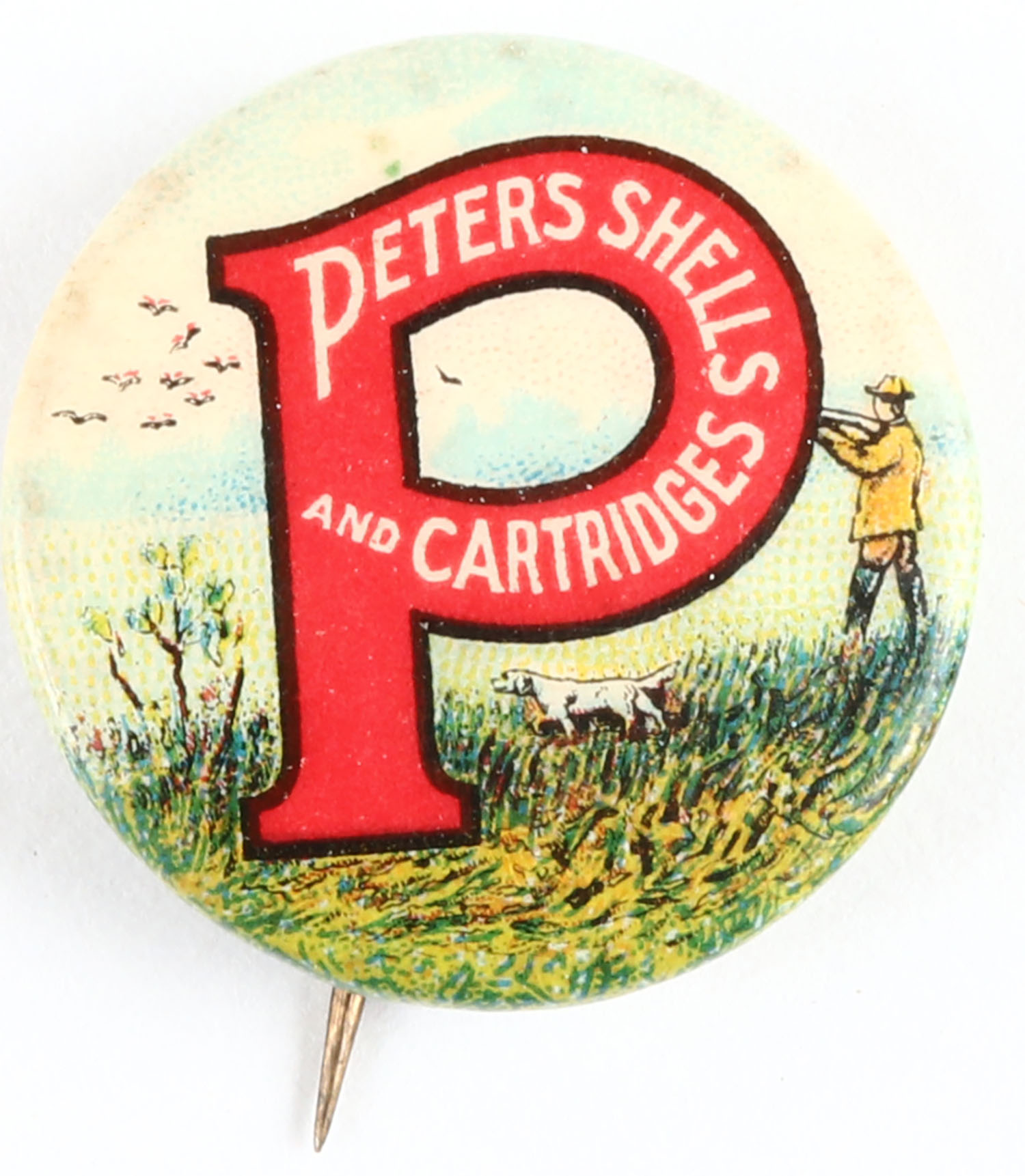 Peters Pinback, pictures a man duck hunting inside a large red P & mallard duck, 7/8'', Bastain Bros paperback, pin is solid & paperback shows minor age soiling . Grade: Excellent - Value: 16 to 60