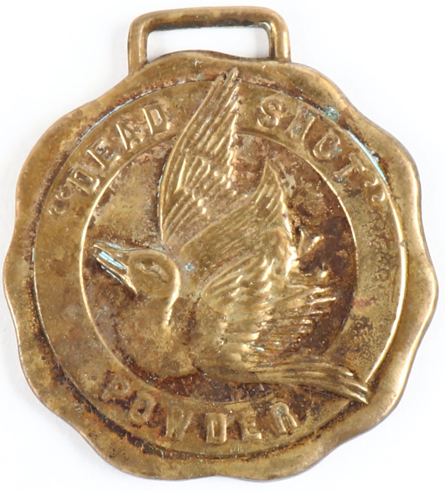 Dead Shot Powder American Powder mills watch fob, has age soiling. Grade: Very Good - Value: 10 to 50