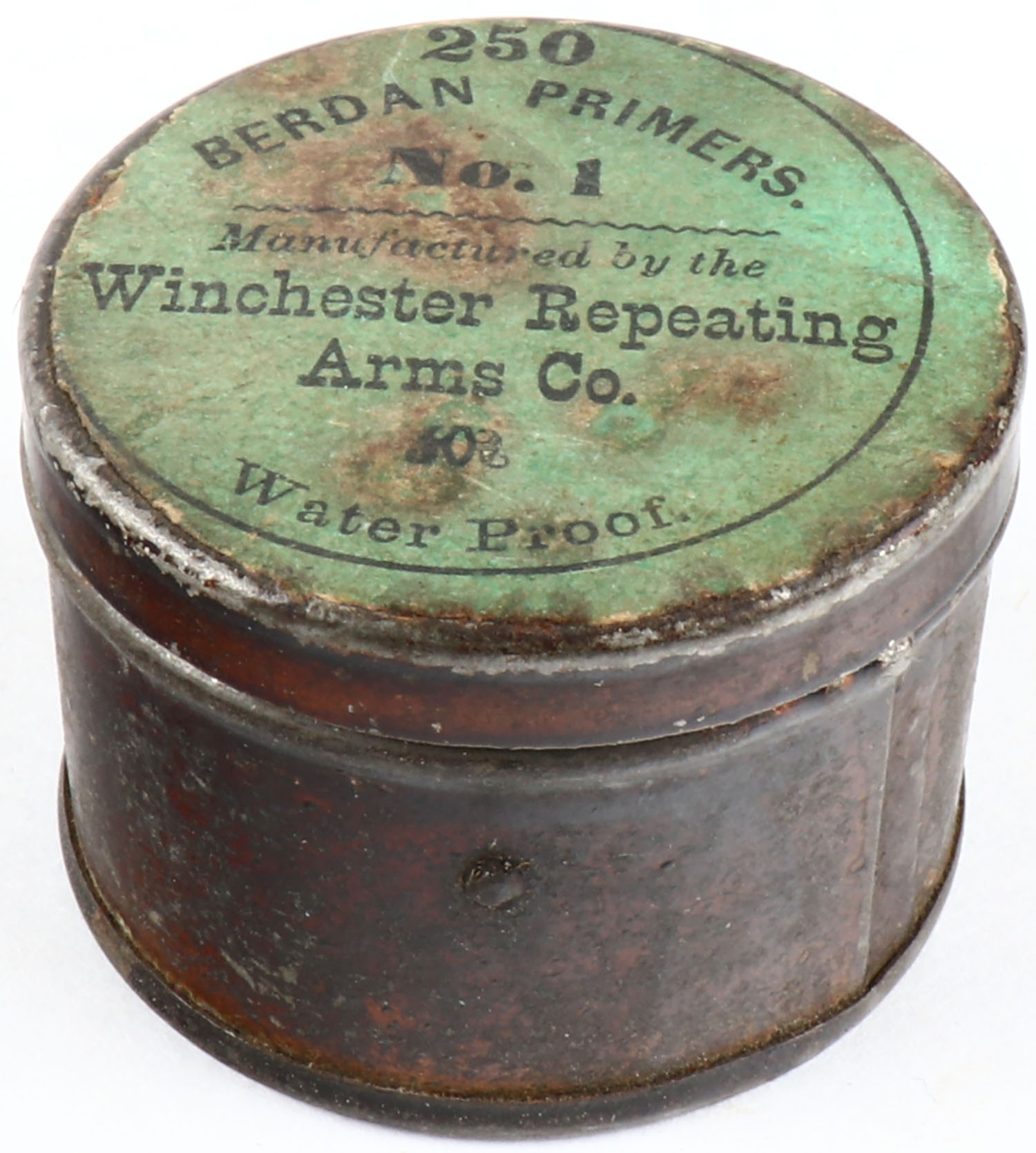 Winchester primers No.1 berdan primers, 250 count, has age soiling, half full. Grade: Very Good - Value: 20 to 200