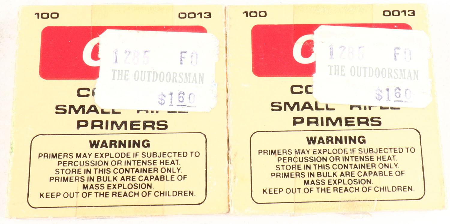 Lot of 2 CCI primer boxes, 1 Full and 1 partial, both have age soiling. Grade: Very Good - Value: 2 to 40