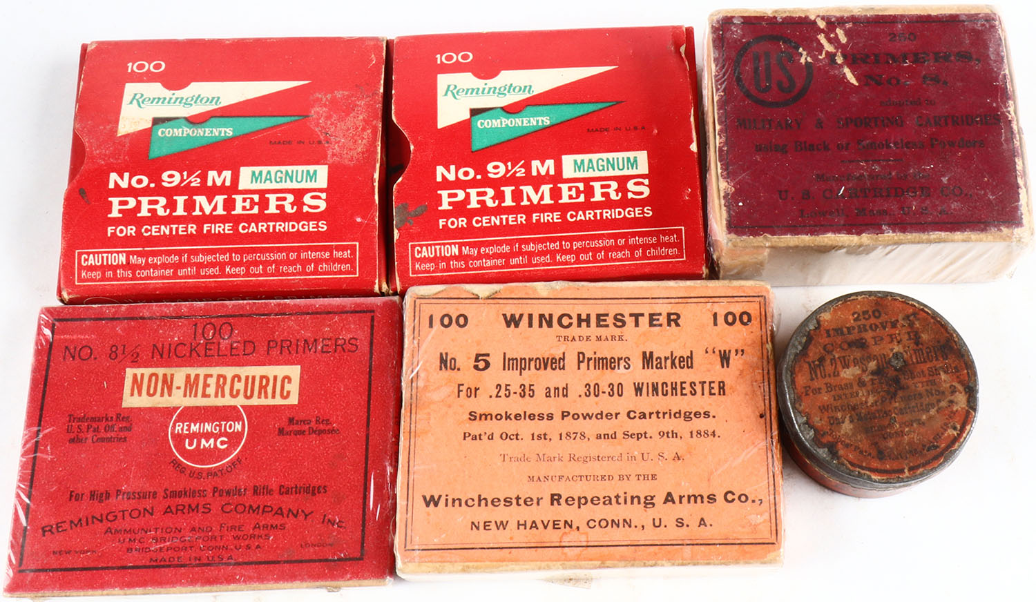 Lot of 6 primer boxes/tin, tin and 2 boxes are empty, 3 partial, both have age soiling. Grade: Very Good - Value: 2 to 60