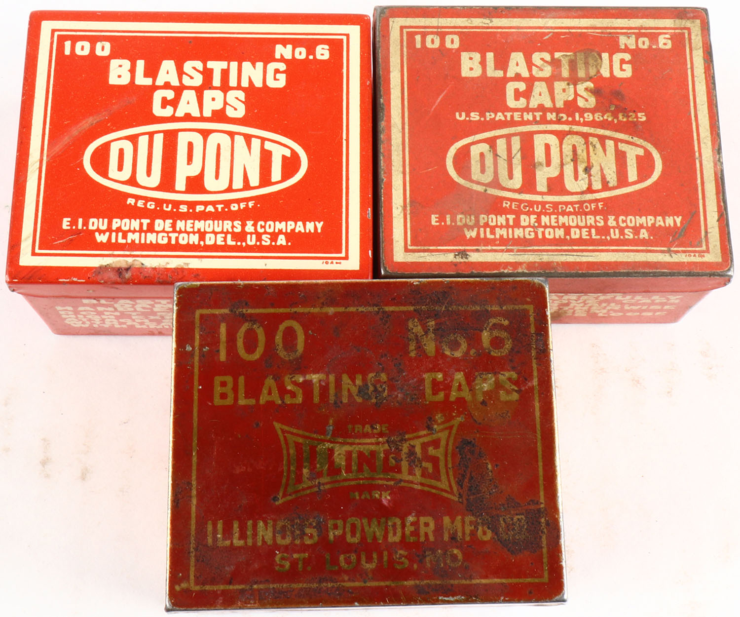 Lot of 3, Empty Illinois/Dupont Powder Mfg Co. Blasting Caps, No. 6, tin has edge wear. Grade: Very Good - Value: 50 to 200