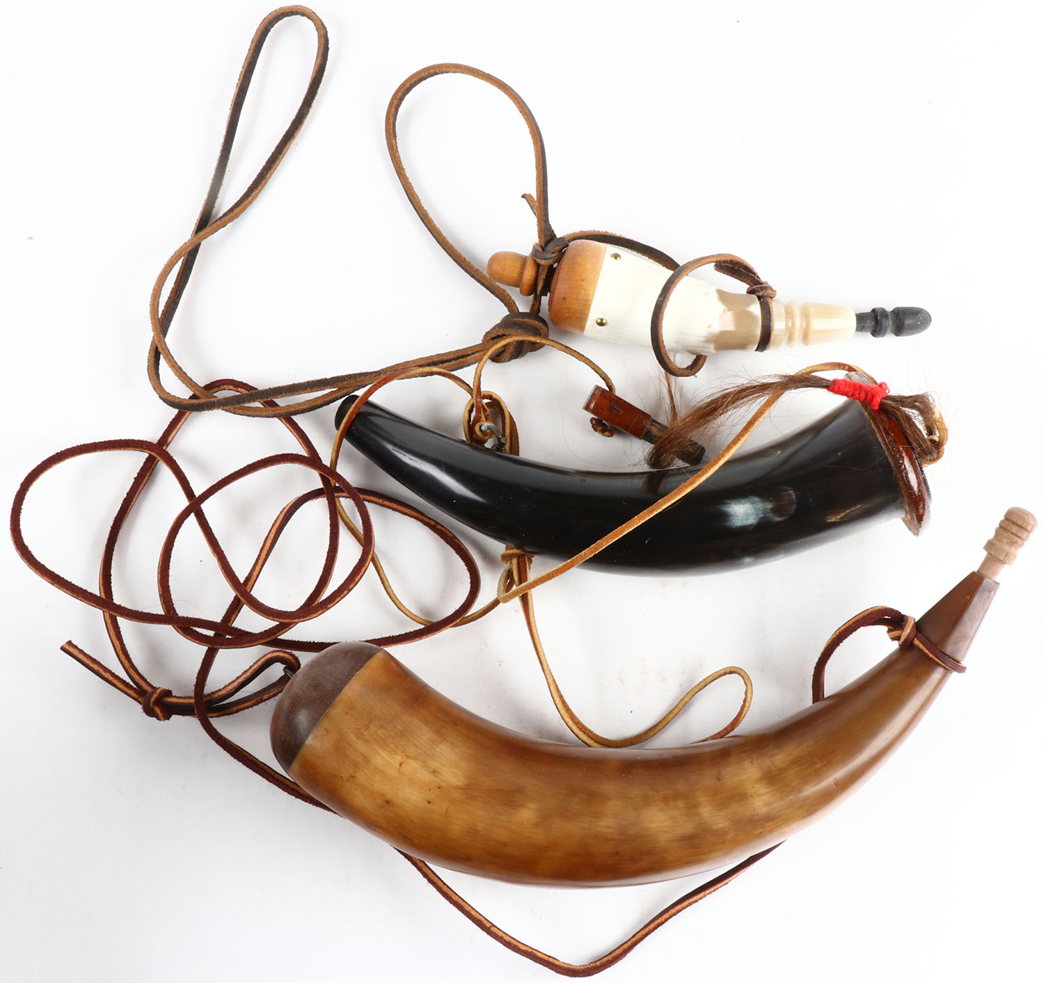 Lot of 3 powder horns , 2 large 1 small. Grade: Excellent + - Value: 10 to 100