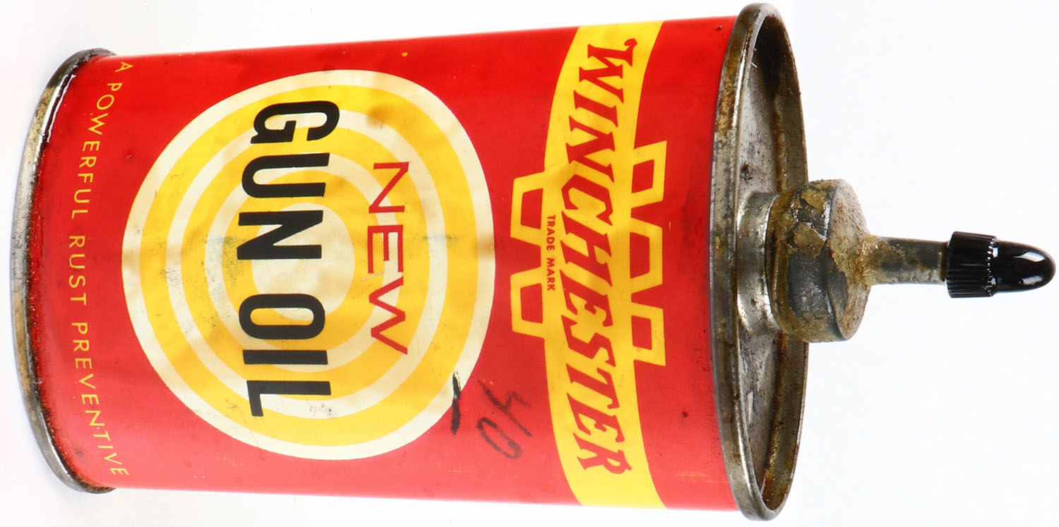 Winchester Oil Tin, New Gun Oil, lead spout & plastic cap, Partial, has age soiling. Grade: Very Good - Value: 10 to 40