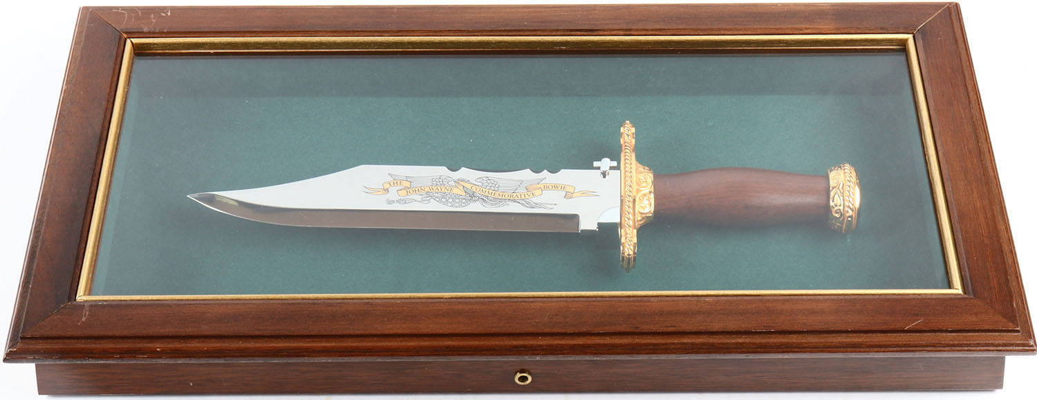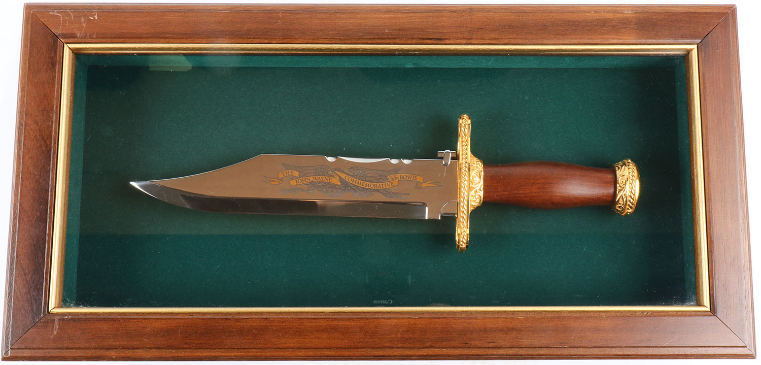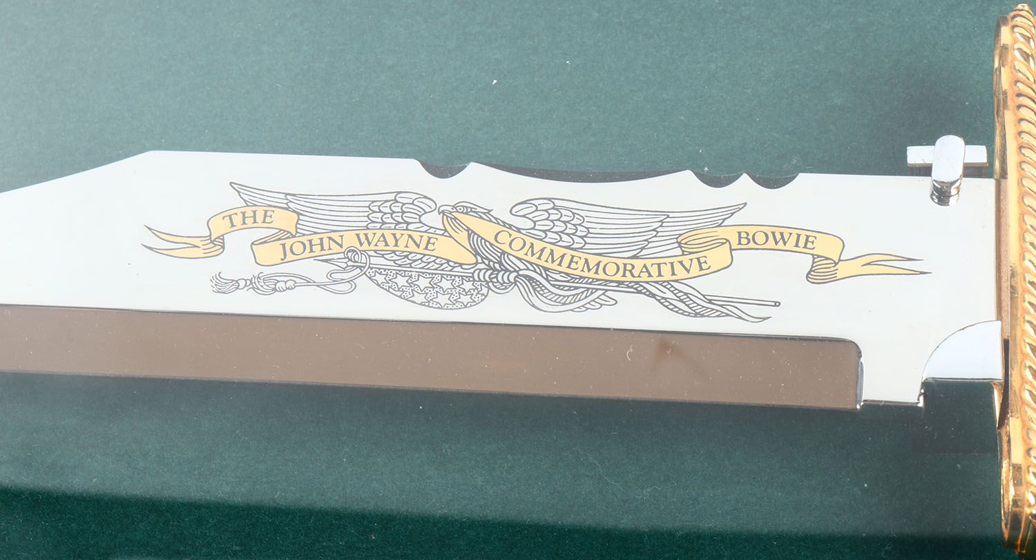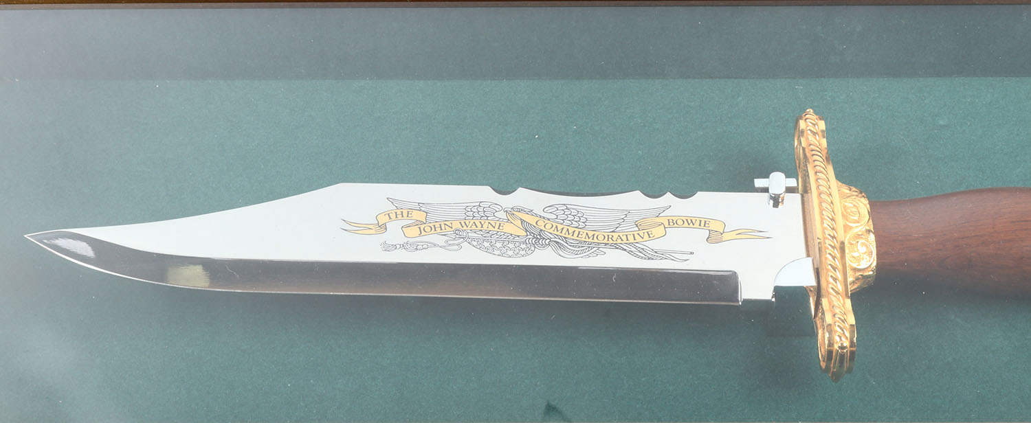 John Wayne Commemorative Bowie knife, in locked display case, 9 1/2'' blade, all very bright and clean. Grade: Excellent ++ - Value: 50 to 200