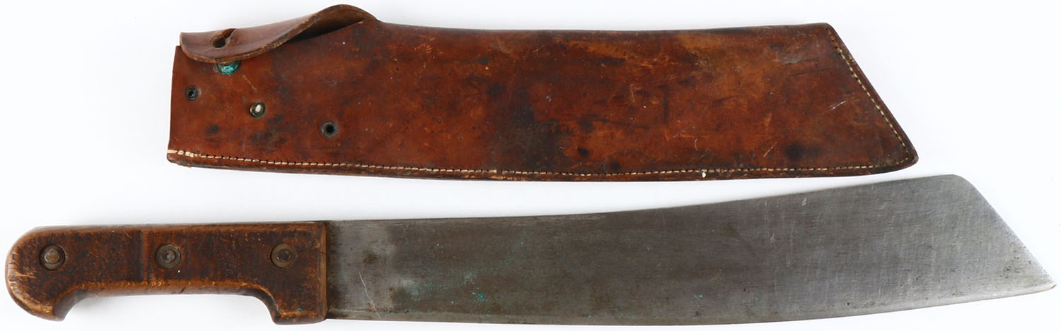 French Sengalese Bolo from Vietnam War Era,, unmarked, 21'' OAL, wood handle, has leather sheath and lots of wear and some rust. Grade: Very Good - Value: 10 to 50