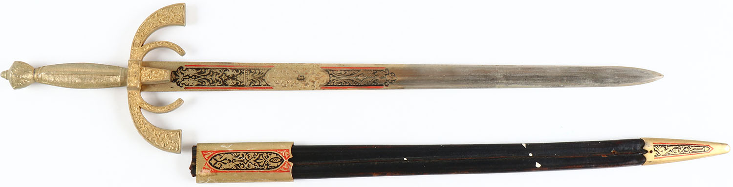 Small Sword, 19'' OAL, intricate design, has leather sheath but it is weak. Grade: Very Good - Value: 20 to 80