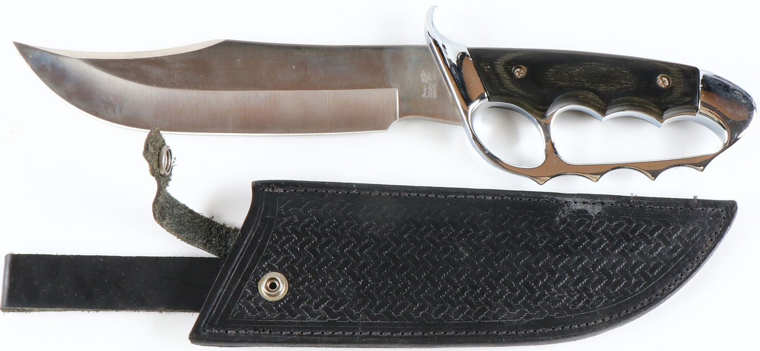 Large Frost Cutlery bowie knife, 9'' fixed blade, all bright and clean, hand guard in handle, has leather sheath. Grade: Excellent - Value: 40 to 200
