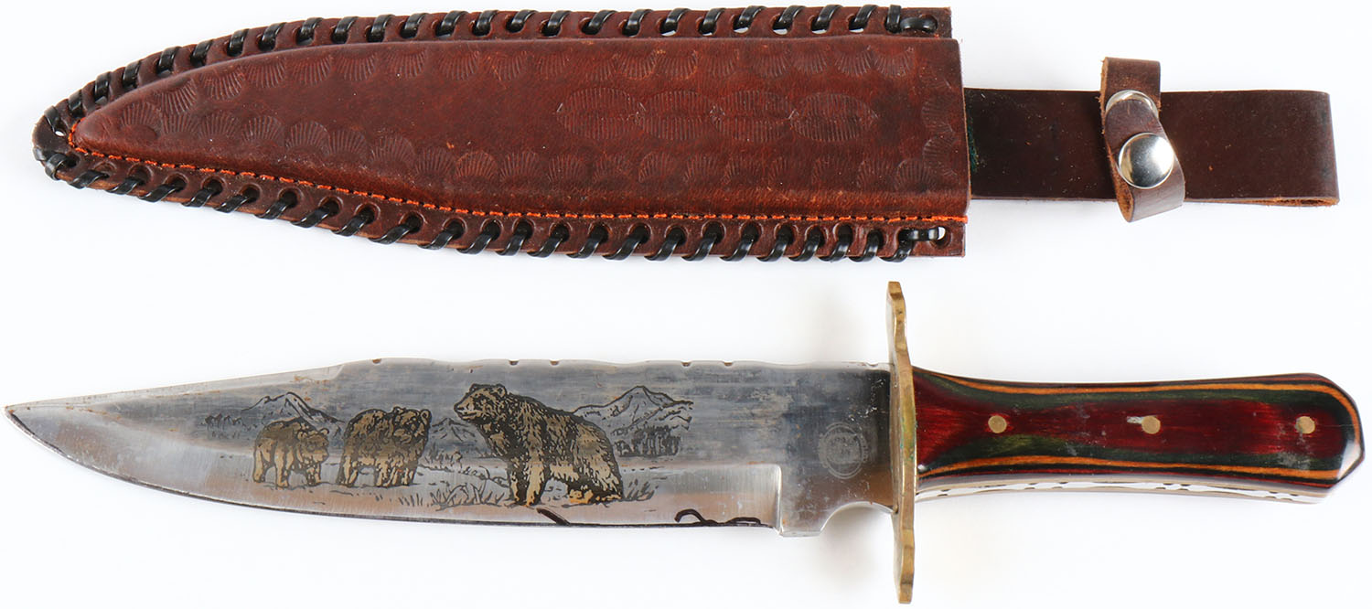 Chipaway knife, full hilt, beautiful wood handle, 9'' fixed blade knife has images of 3 bears in a field, has age soiling to blade, has leather sheath. Grade: Very Good ++ - Value: 30 to 90