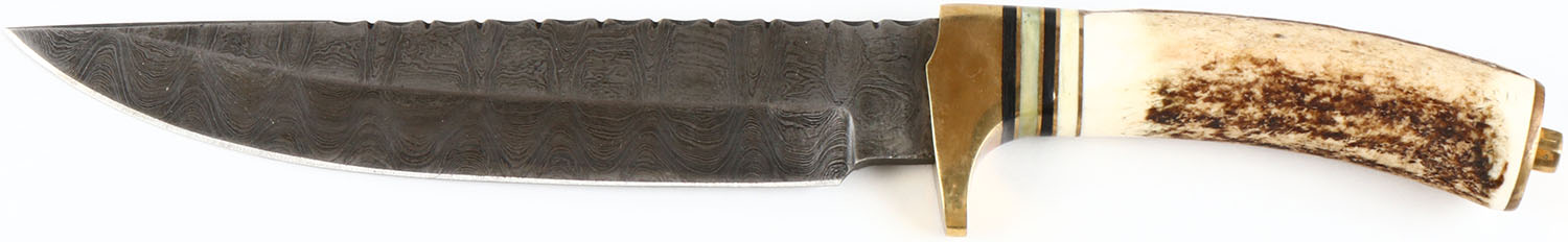 Unmarked knife, full hilt, stag handle, 8'' fixed blade knife, damascus blade. Grade: Excellent - Value: 20 to 80