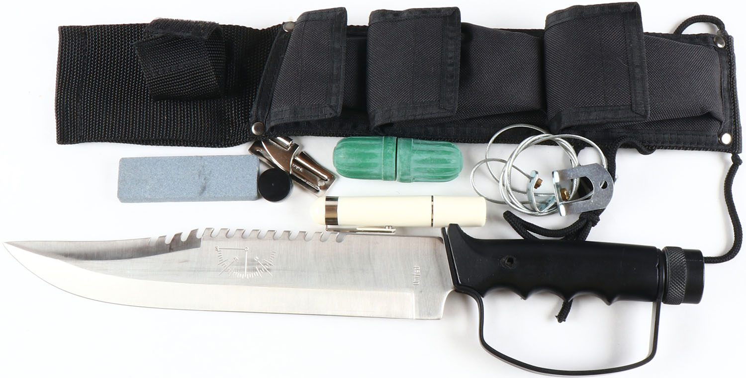 Survival United knife, # UC122, 9'' fixed bladed knife, has sheath with various compartments with survival gear inside, flashlight, string, cable and others, blade has a 90 degree angle etched into one side. Grade: Excellent ++ - Value: 10 to 50