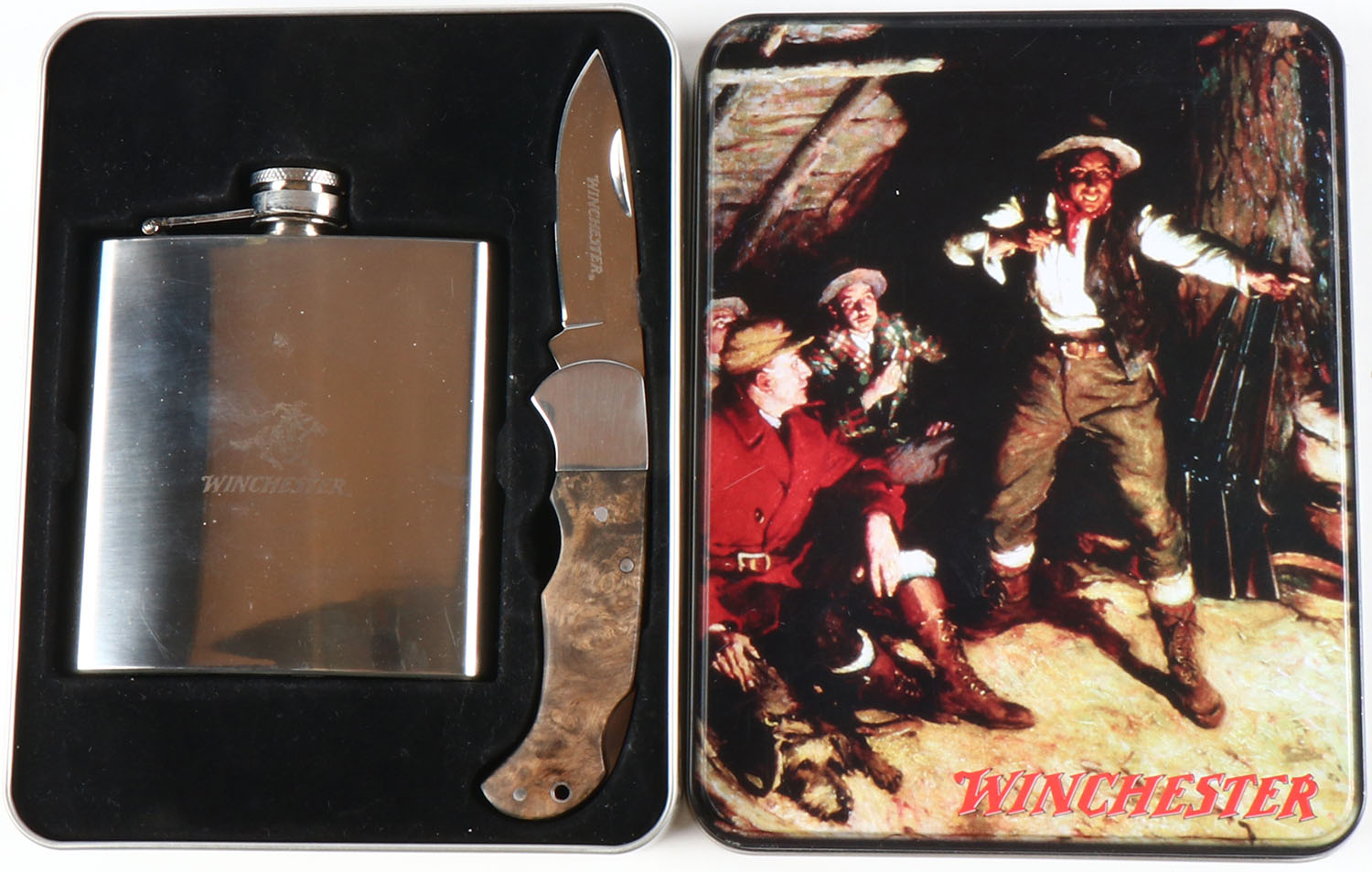 Winchester knife and flask kit, 2'' folding blade knife, in orginal tin, NIB. Grade: MINT - Value: 10 to 40