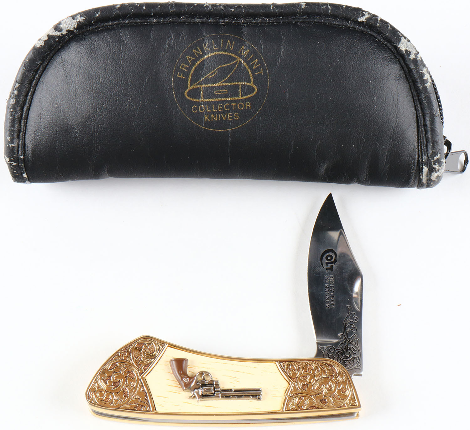 COLT knife by Franklin Mint collectors knives, 2 1/2'' folding blade knife, 1955 python on handle .357 mag., in orginal soft case, NIB. Grade: MINT - Value: 16 to 50
