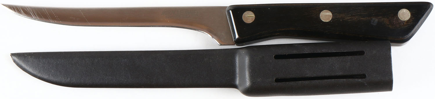 Miracle Maid knife. 5 1/2'' blade, wood handle, hard plastic sheath, blade has been sharpened. Grade: Very Good ++ - Value: 10 to 40
