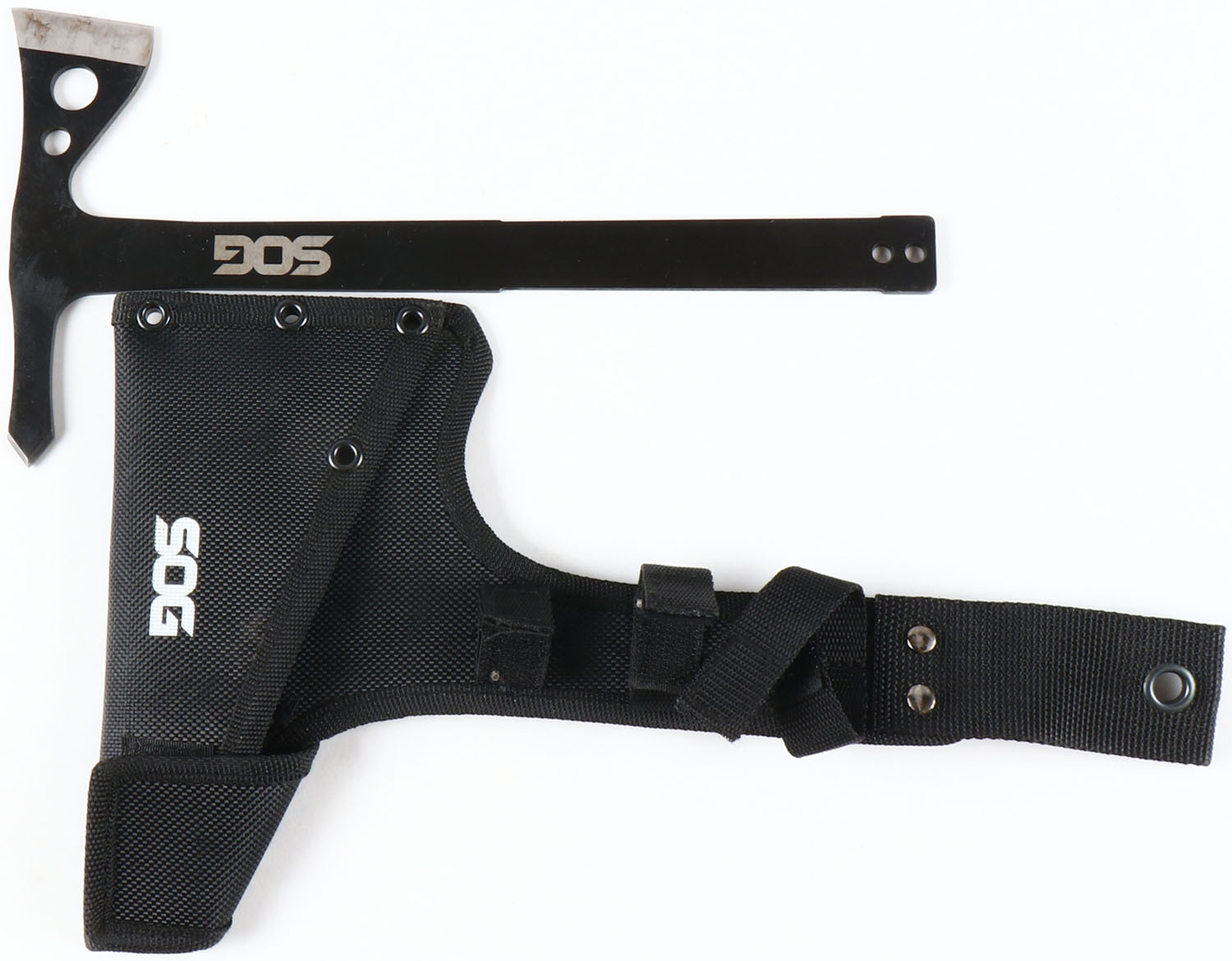 SOG hatchet, in original case, 10 '' OAL. Grade: Excellent - Value: 16 to 80